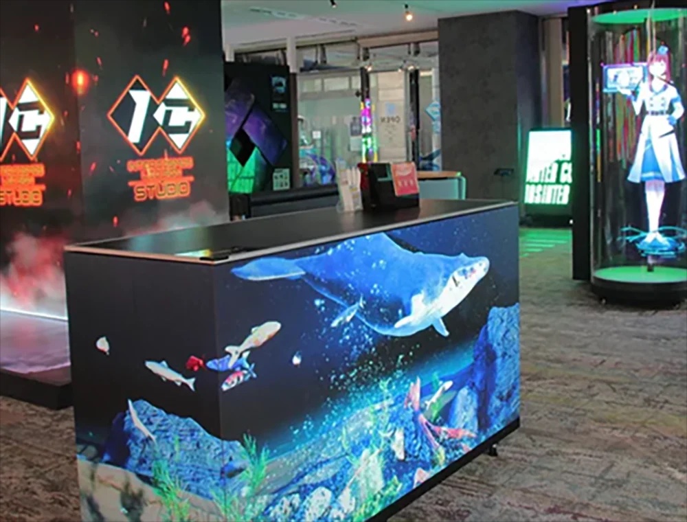 カウンタービジョンは、曲面のラウンド形状が印象的なカウンター一体型LEDビジョンです。従来のデジタルサイネージよりもお客様との距離が近く、受付案内・キャンペーン・商品訴求などを自然な導線で届けることができます。接客時の補助ツールとしても、ブランド演出としてもご活用いただけます。